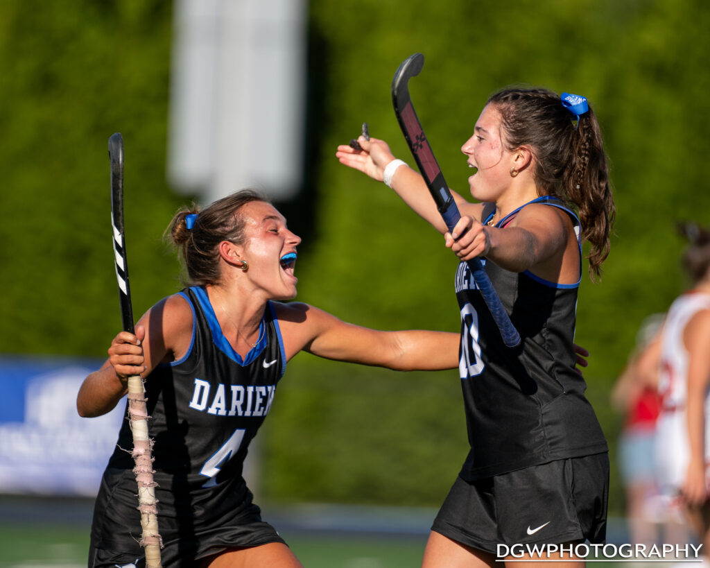 Darien vs. Greenwich – High School Field Hockey September 12, 2025 By David Whitham Darien’s Anna Duarte celebrates with Adriana Gromelski after Gromelski’s second goal of the game during the Blue Wave’s 4-1 victory over Greenwich.