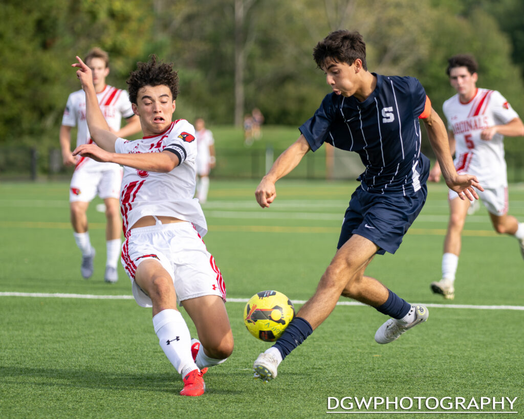Greenwich vs. Staples – High School Soccer September 17, 2025 By David Whitham Greenwich’s Henry Davis blocks a shot by Staples’ Gabriel Duque during Greenwich’s 4-3 victory Tuesday.